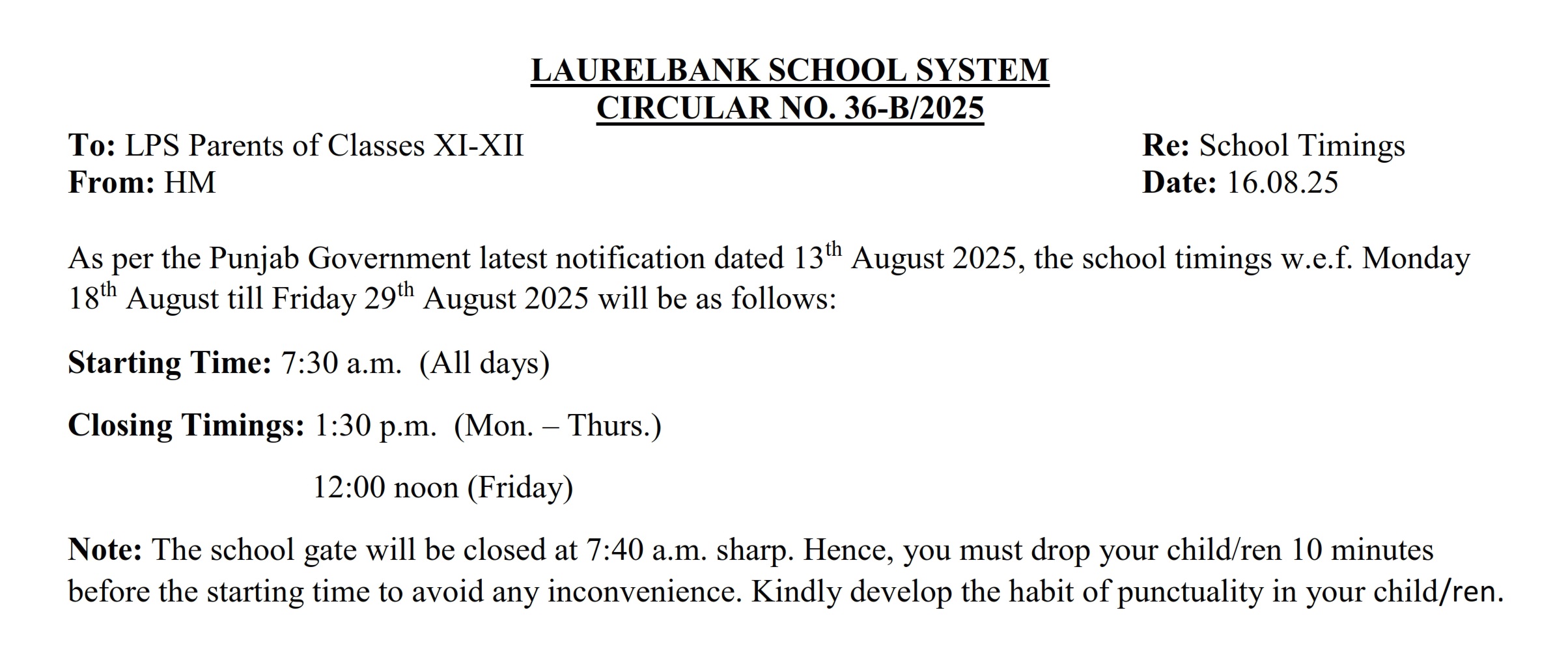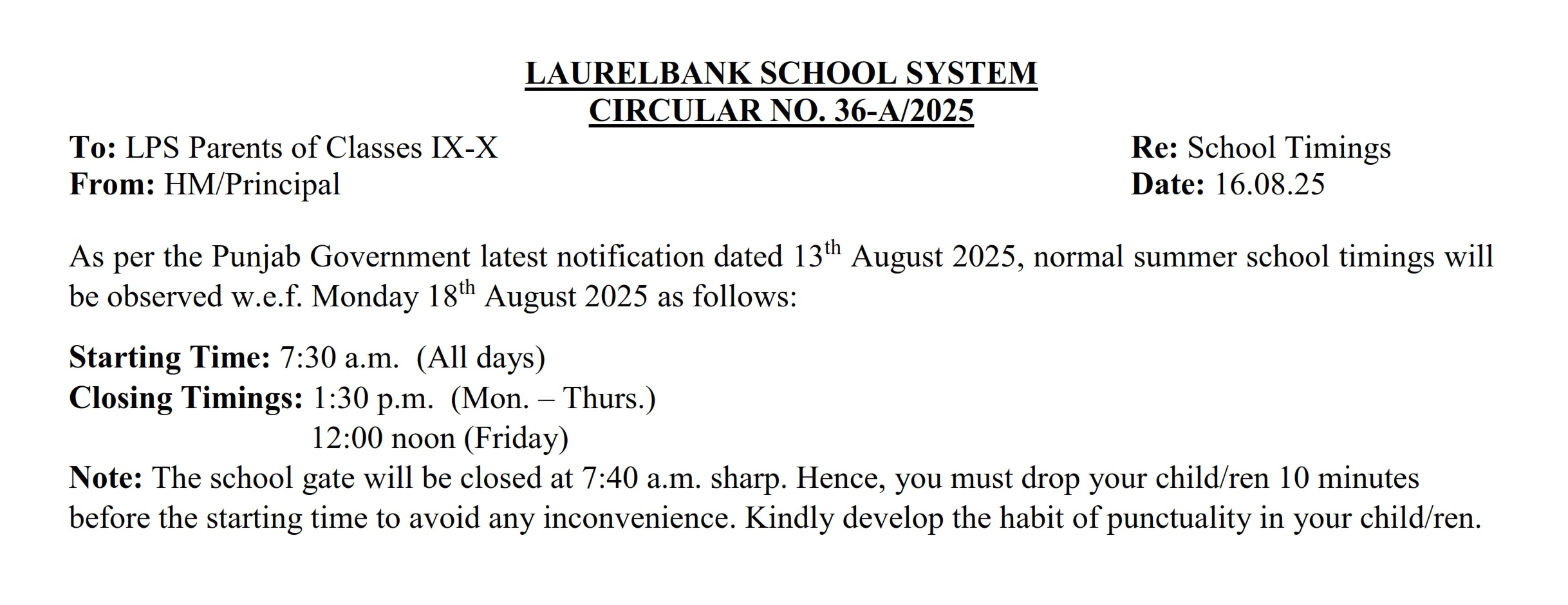 Circular Nos. 36-A & 36-B (School Timings) Dated: 16 August, 2025